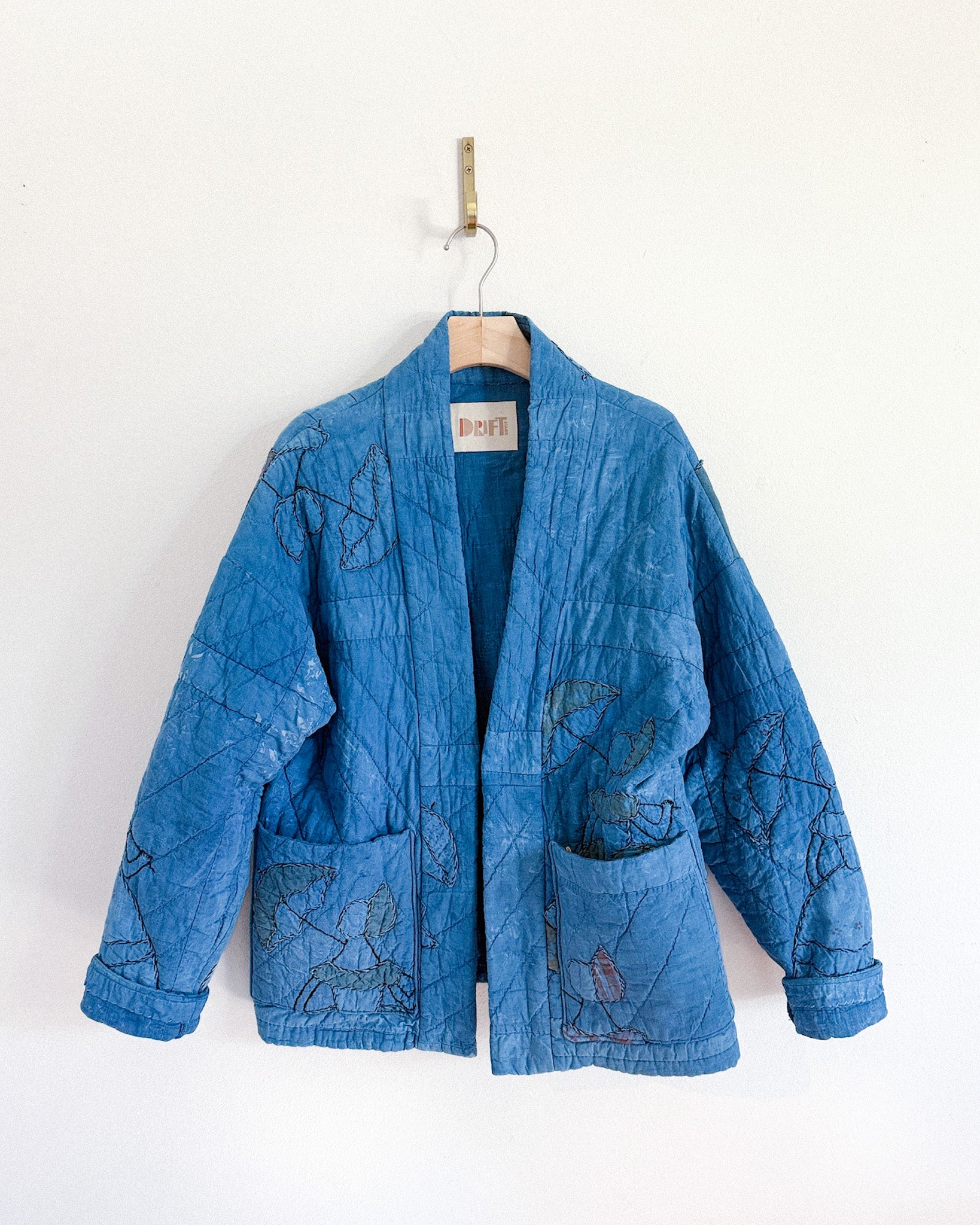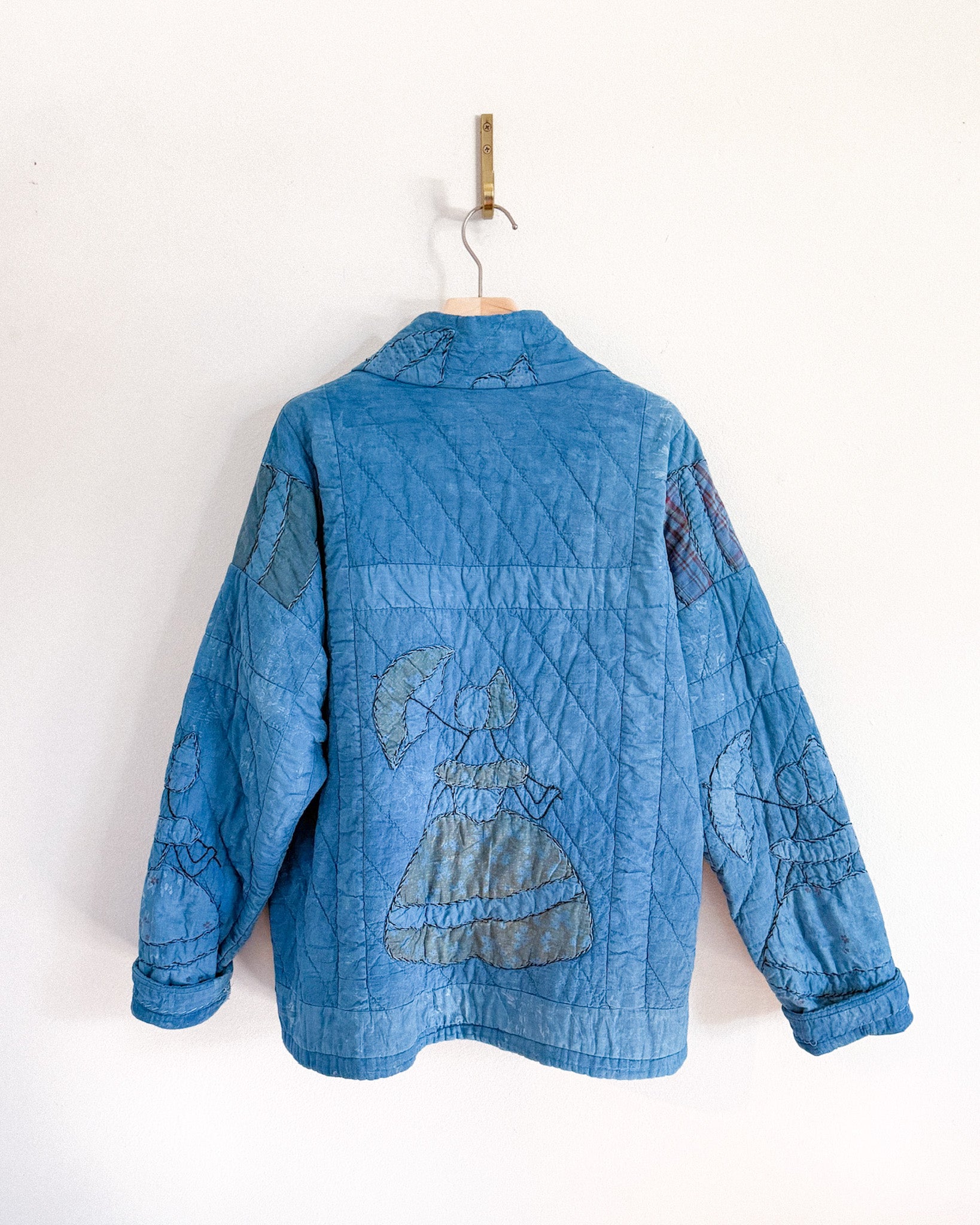 MADE FROM A VINTAGE HAND SEWN QUILT. EMBROIDERY AND APPLIQUE DETAILS. OVERDYED IN INDIGO